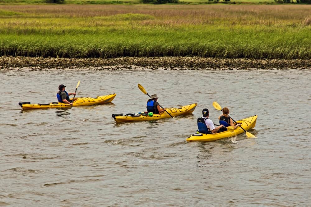 Shem Creek kayaking allows visitors to paddle through peaceful marsh waterways while spotting wildlife like dolphins, pelicans, and herons.
