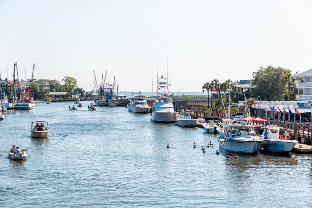 Shem Creek in Mount Pleasant is famous for its waterfront restaurants, scenic boardwalk, shrimp boats, and dolphin sightings.